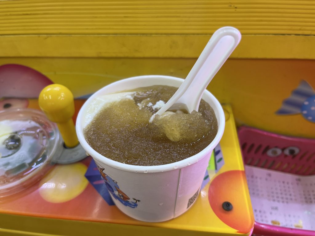 之後我們又去逛草屯形象商圈,當天沒有人潮,唯一的人潮就在冷凍豆花搖搖冰。我們點綜合豆花加湯圓,一碗45元,但該店家沒椅子坐,我們跑去隔壁的抓娃娃機坐著吃,剛好有兩張椅子可以坐。豆花上面有一層冰,內餡給的很大方,但沒有覺得特別之處。室友本來要吃搖搖冰,一問之下已經沒再賣搖搖冰。